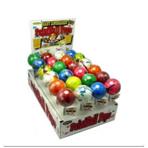 Paintball Pops deliver a classic jawbreaker with eye popping splatters of colors. Each pop has nine layers of fruity flavors that last for hours. Now that the jawbreaker is on a stick, you can enjoy all of the flavor without the mess.